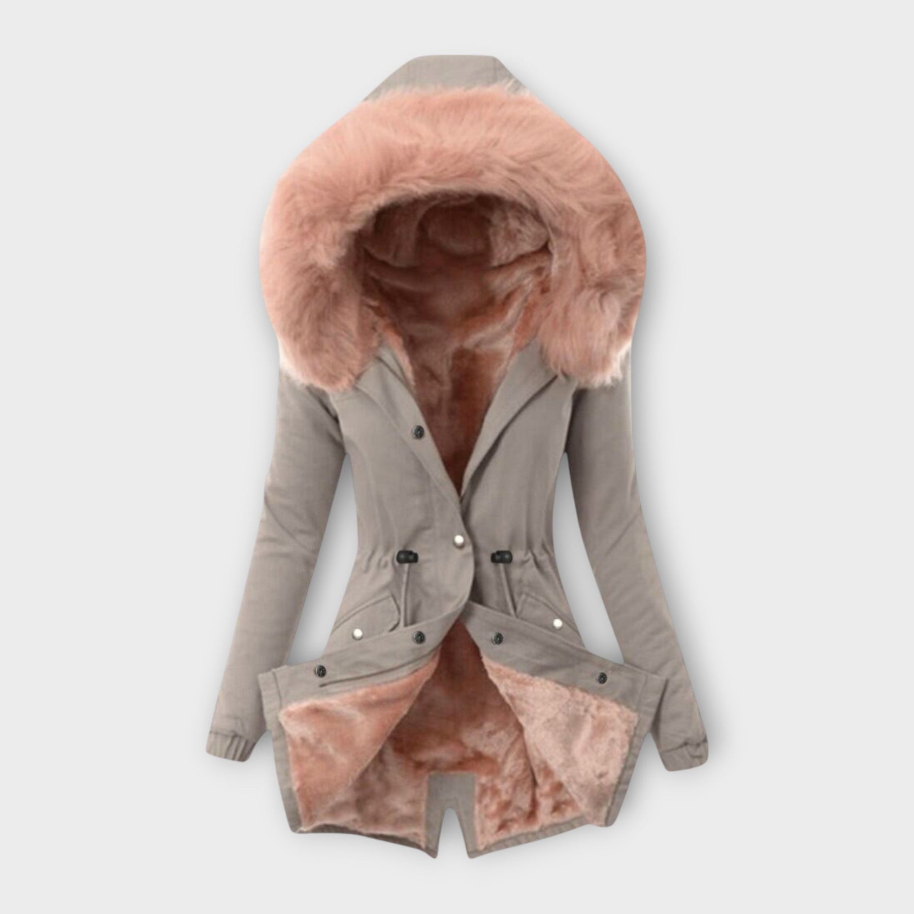 The generous hood is trimmed with soft faux fur, which not only protects against wind and weather but also adds a touch of elegance.
